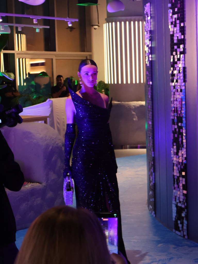 If you saw me lingering a little too long near the model in that midnight blue gown, sharp shoulders, glittering all the way down, dripping elegance with every step… no, you didn’t. 😌